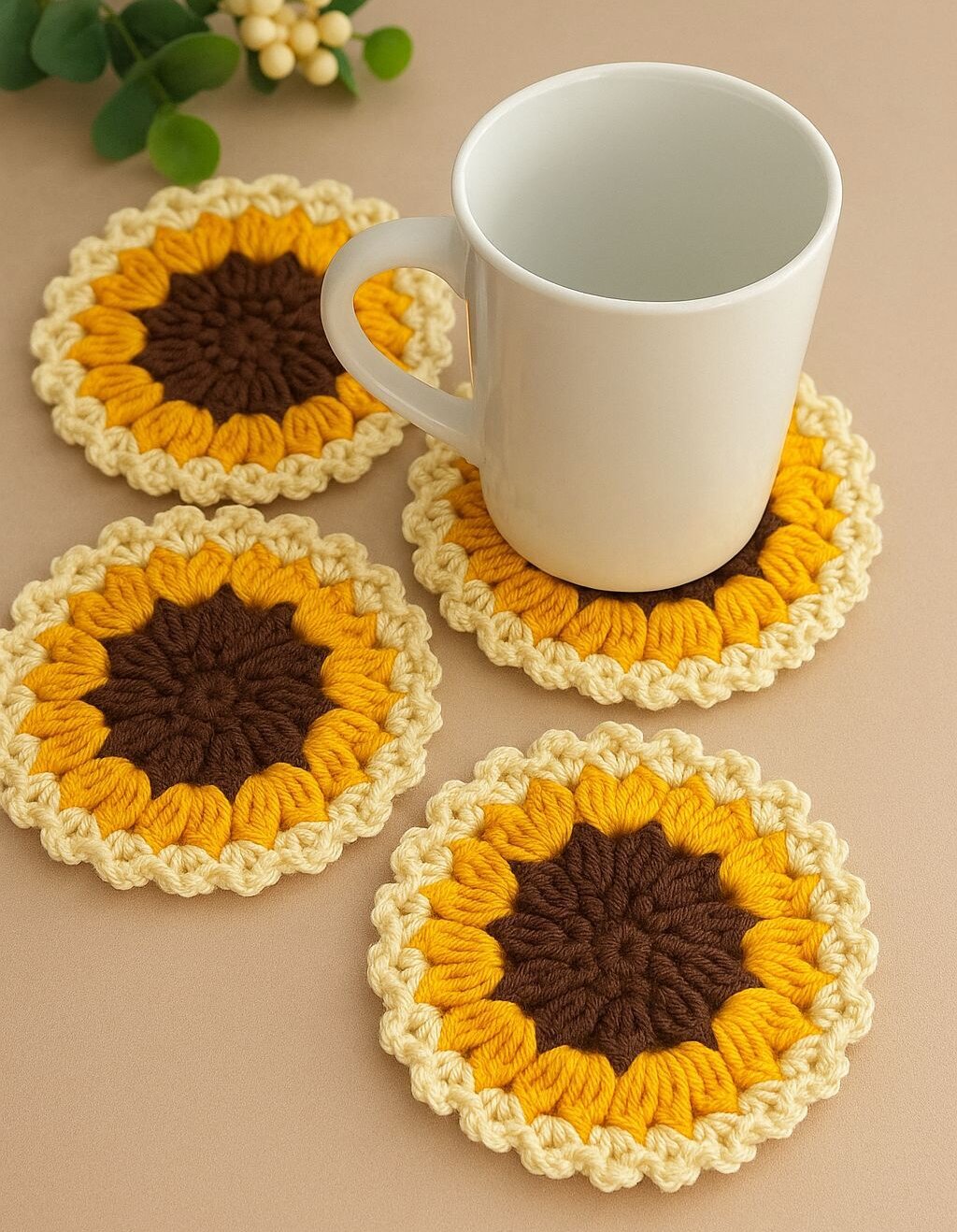 They are handcrafted coasters featuring a sunflower pattern with yellow petals and a brown center, typically made from high-quality cotton yarn for durability and absorbency. They are suitable for both hot and cold beverages and help protect furniture from water marks and heat. The finished product size is usually around 10cm in diameter…