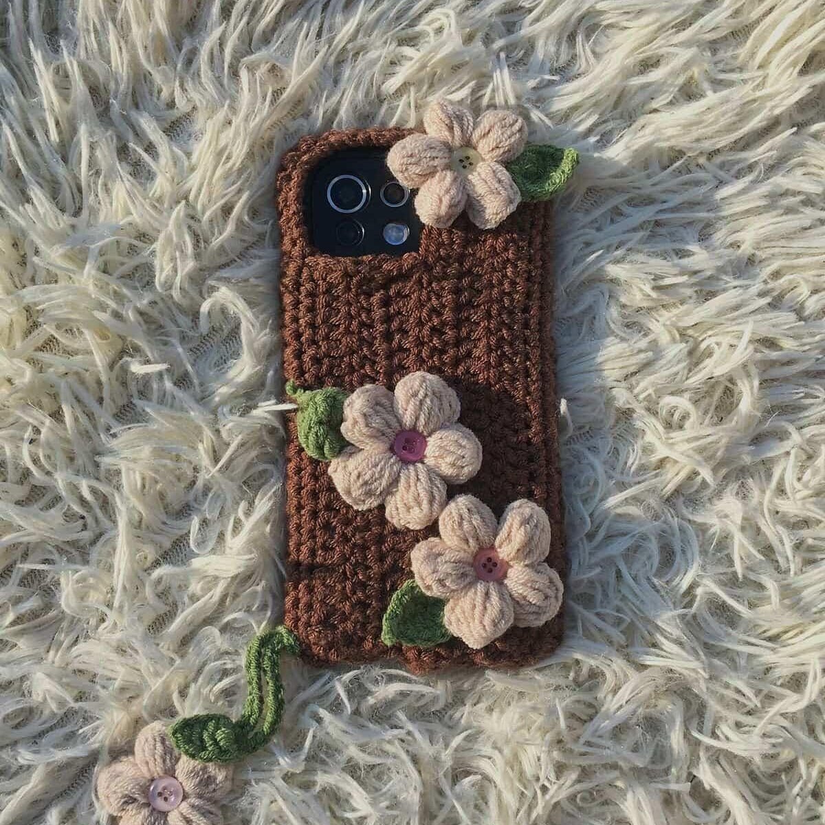 handmade crochet phone case with floral decoration